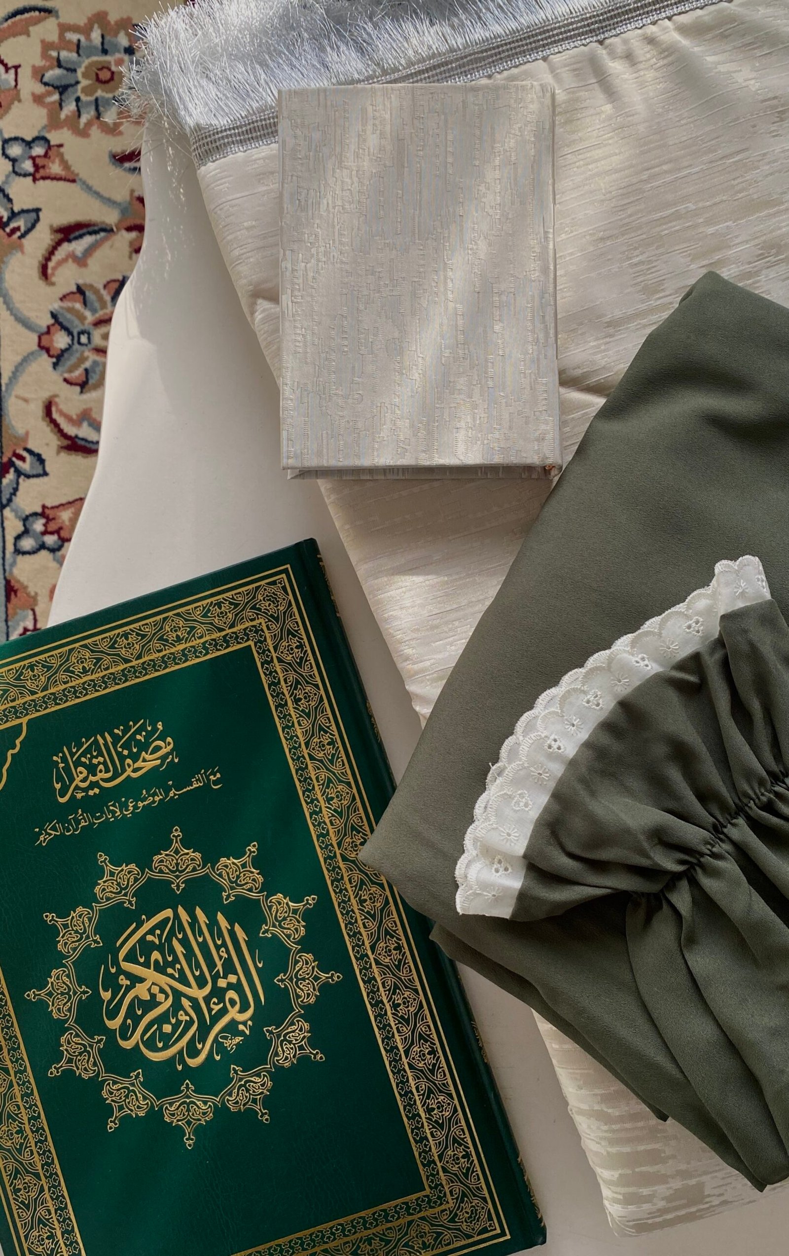 محتوى الطقم (مصحف مغلف ، لبس صلاه واسع فضفاض بطول ٥٨ سانتي ، سجاده مبطنه إسفنج )