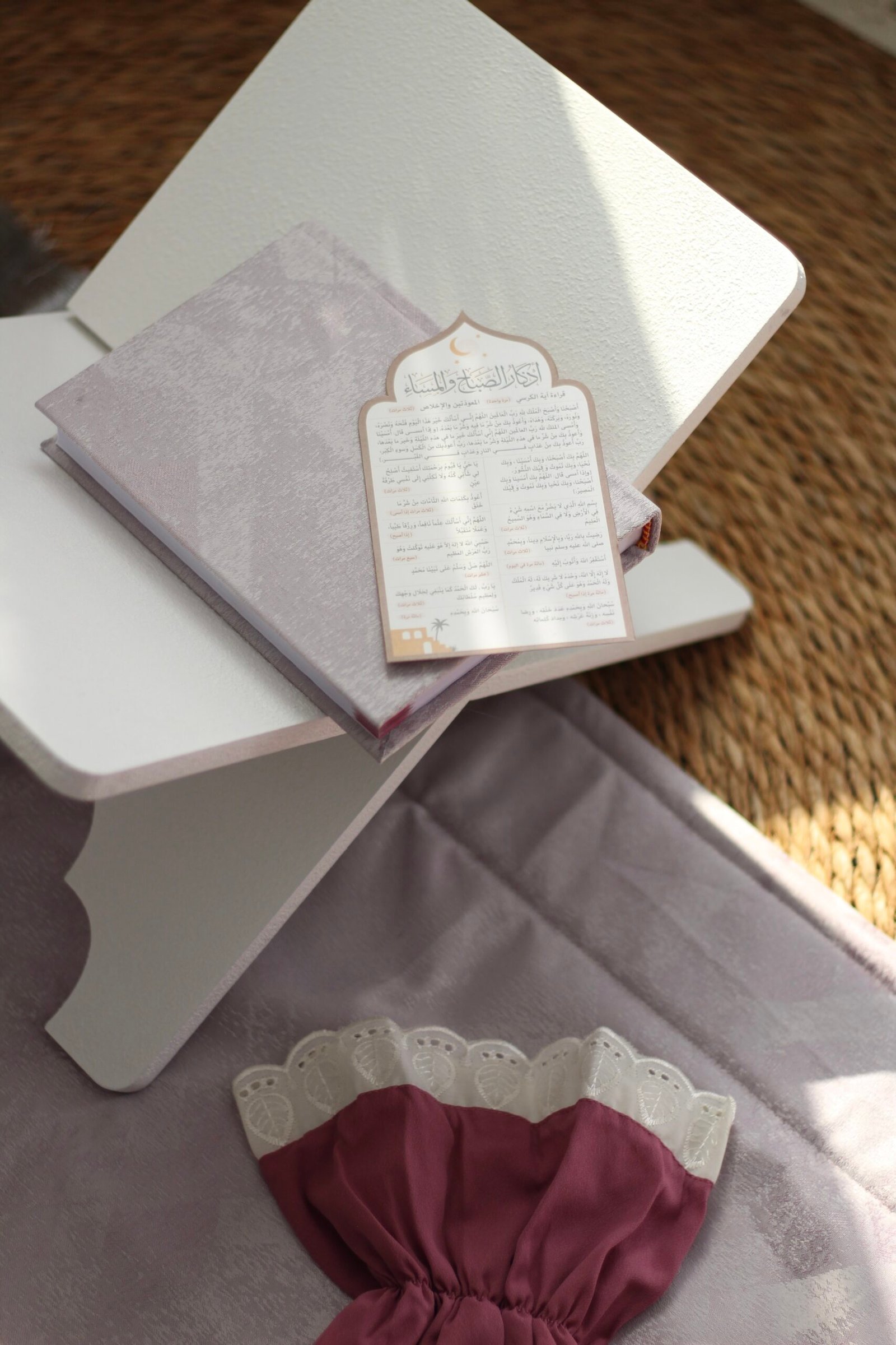 محتوى الطقم (مصحف مغلف ، لبس صلاه واسع فضفاض بطول ٥٨ سانتي ، سجاده مبطنه إسفنج )