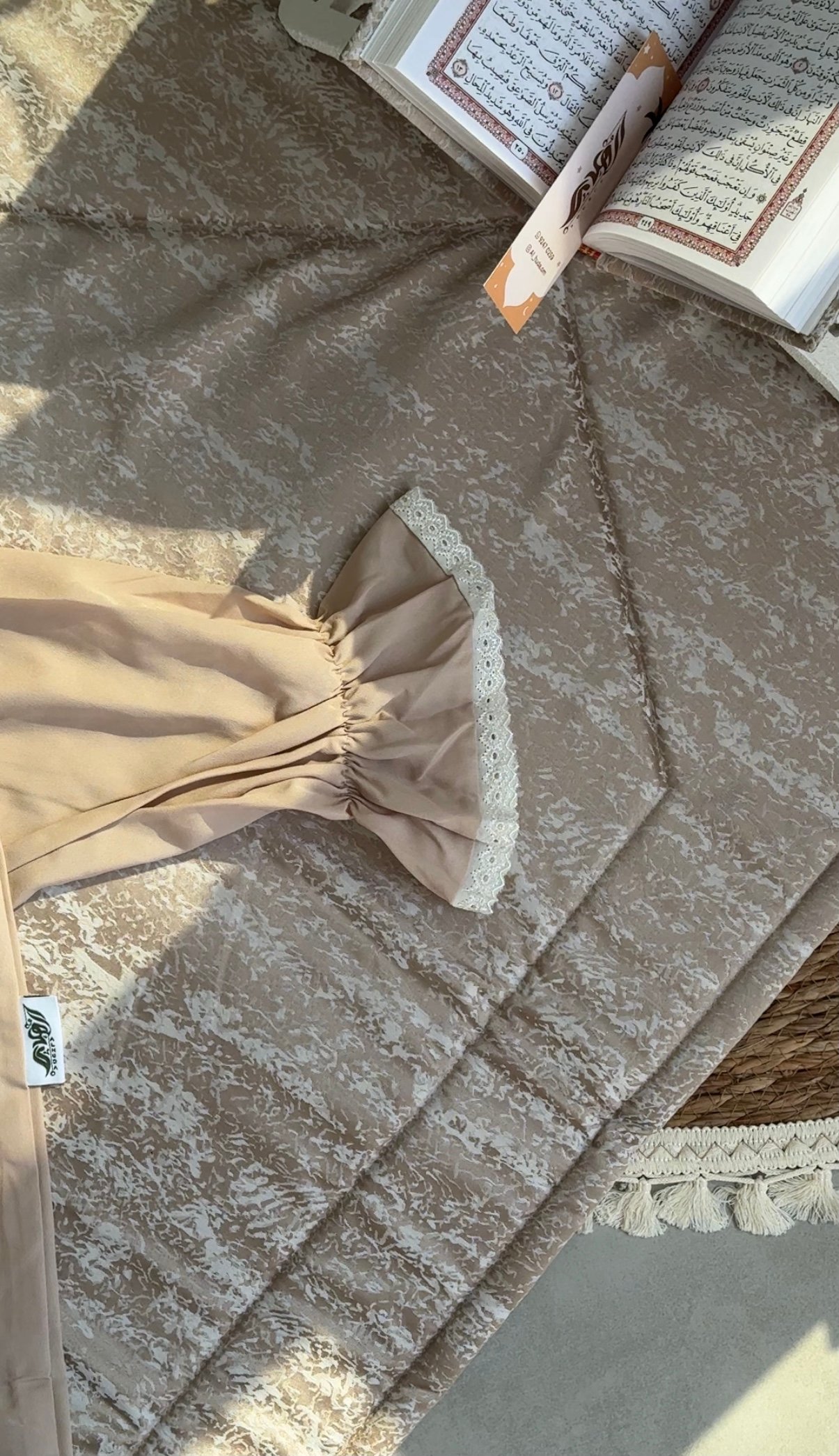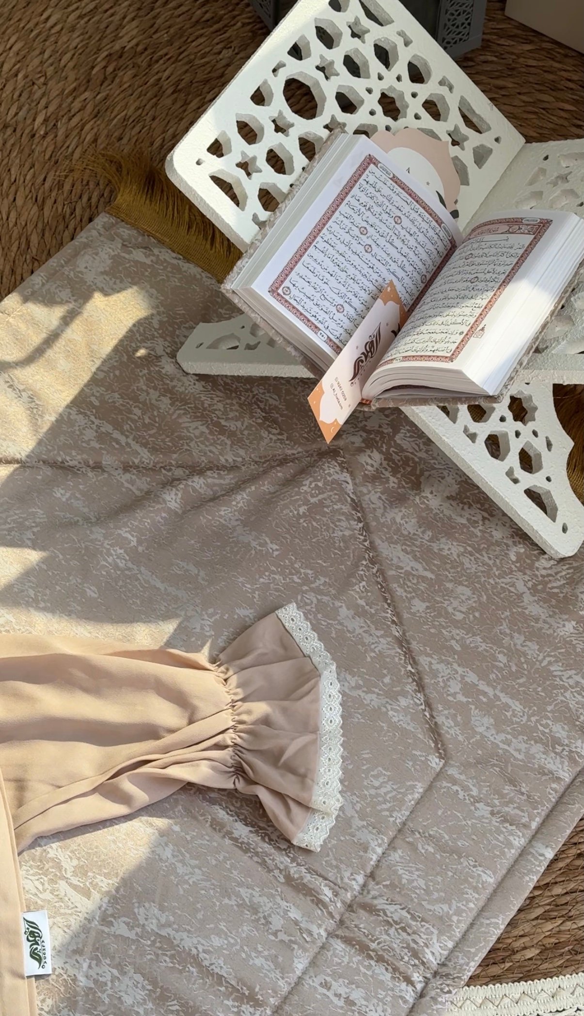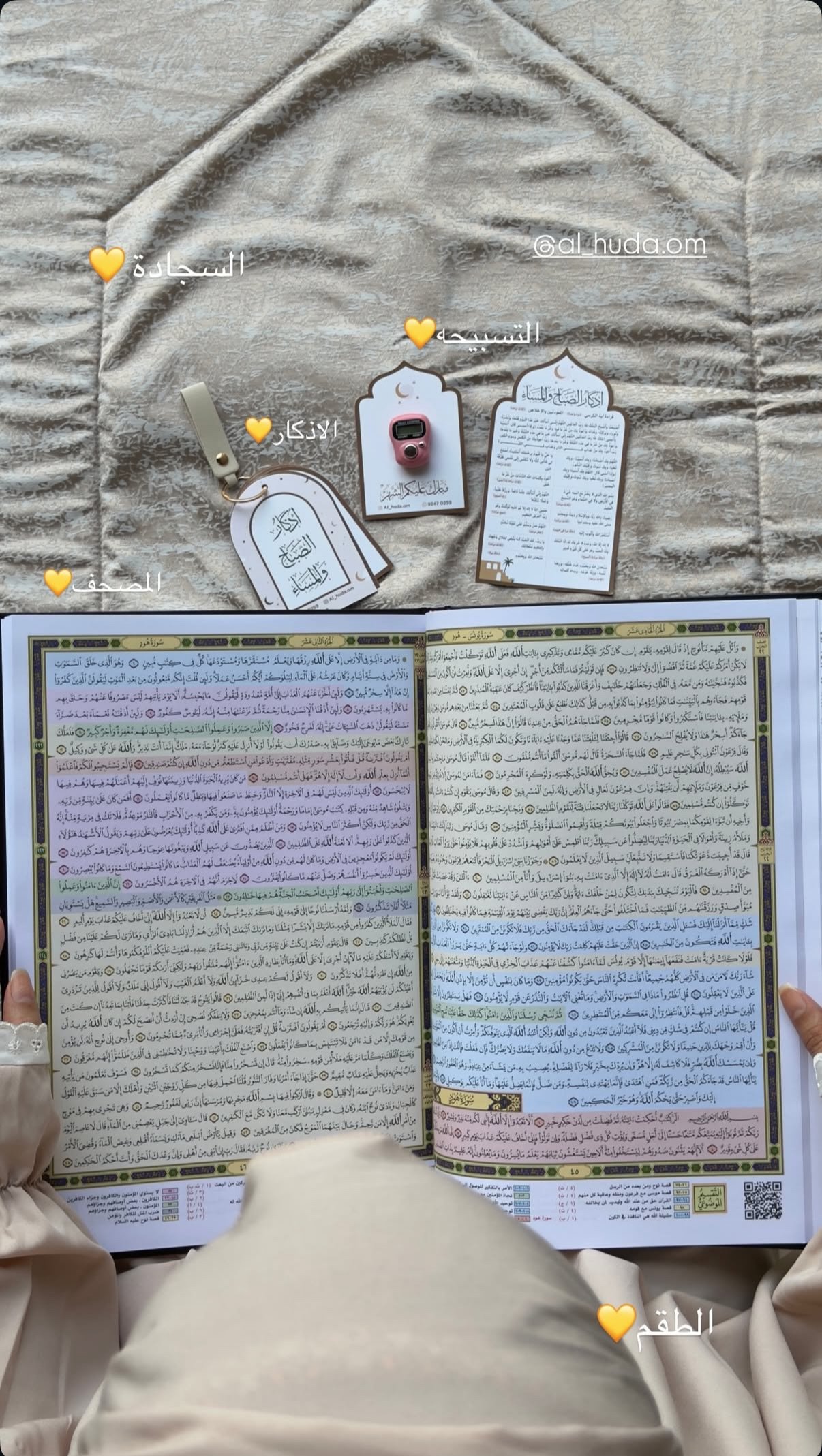 محتوى الطقم (مصحف مغلف ، لبس صلاه واسع فضفاض بطول ٥٨ سانتي ، سجاده مبطنه إسفنج )