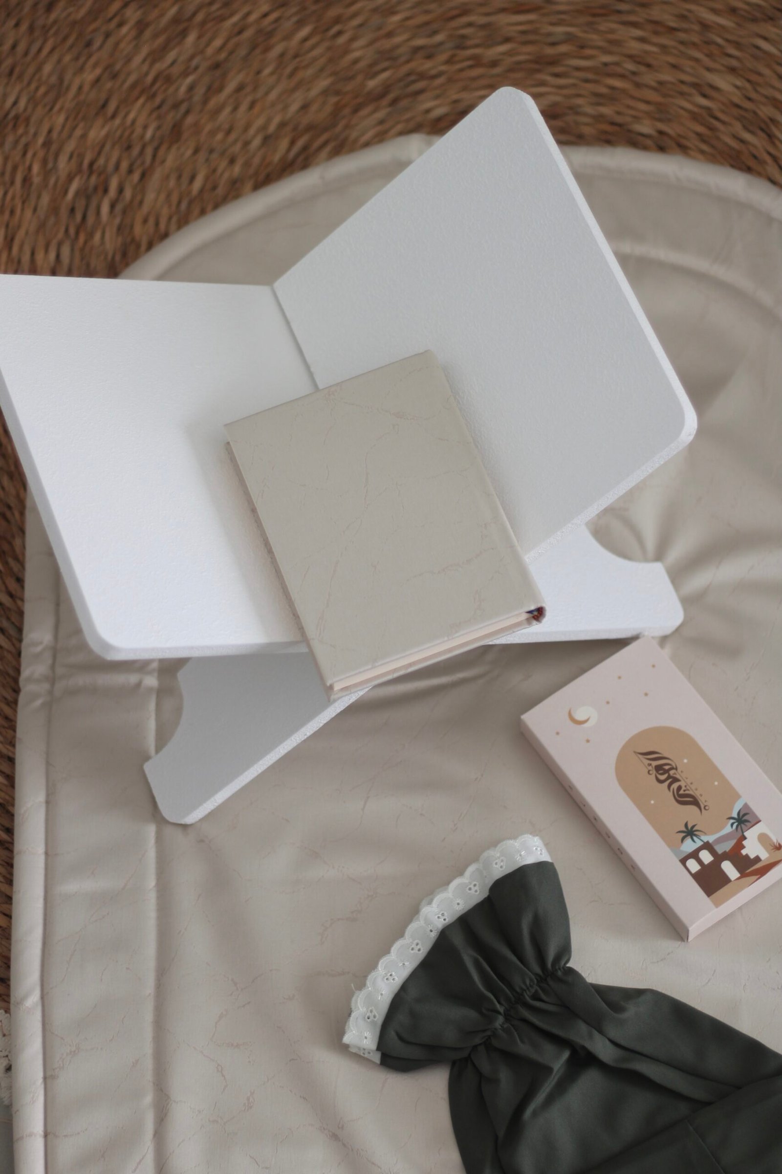 محتوى الطقم (مصحف مغلف ، لبس صلاه واسع فضفاض بطول ٥٨ سانتي ، سجاده مبطنه إسفنج )
