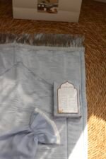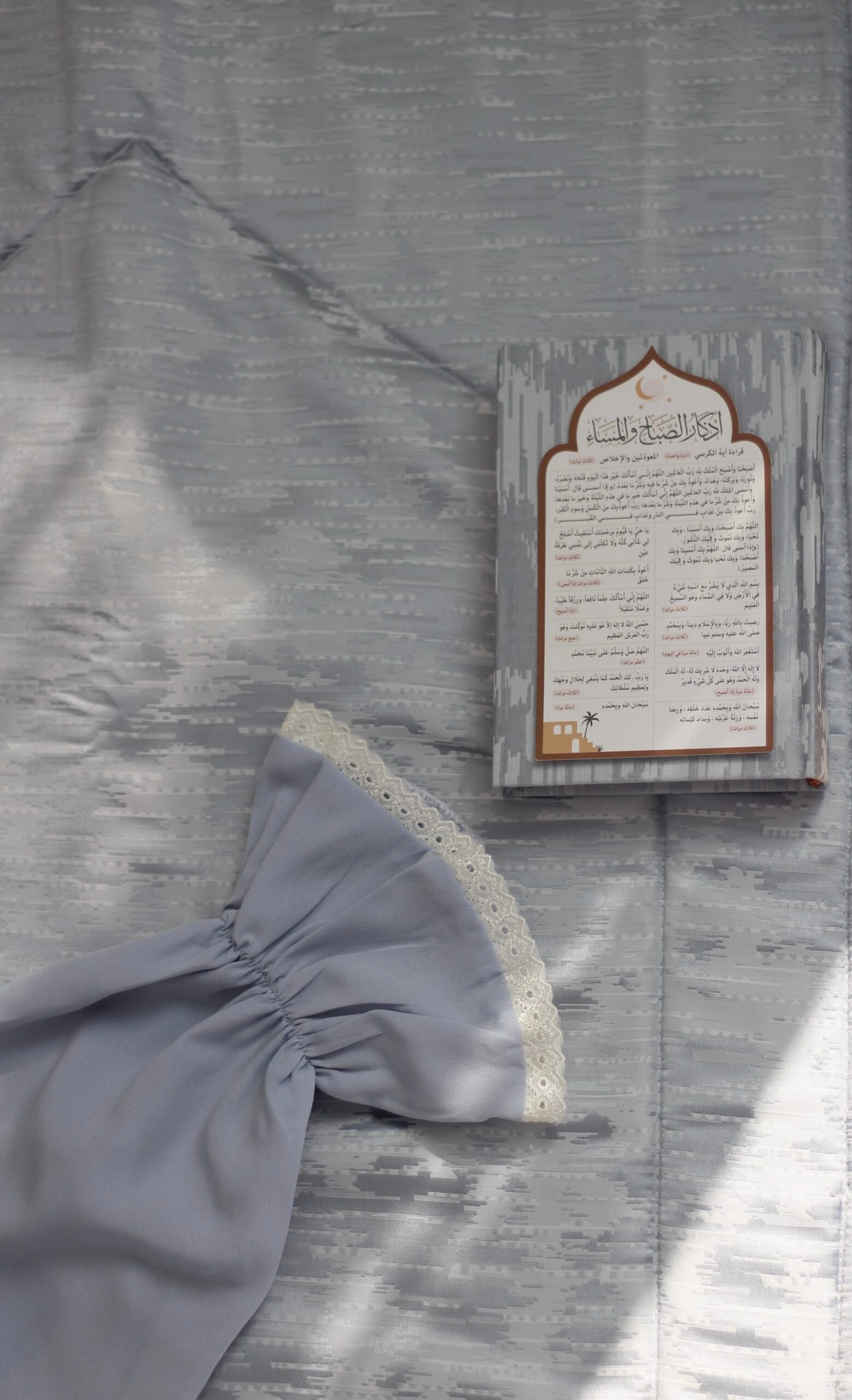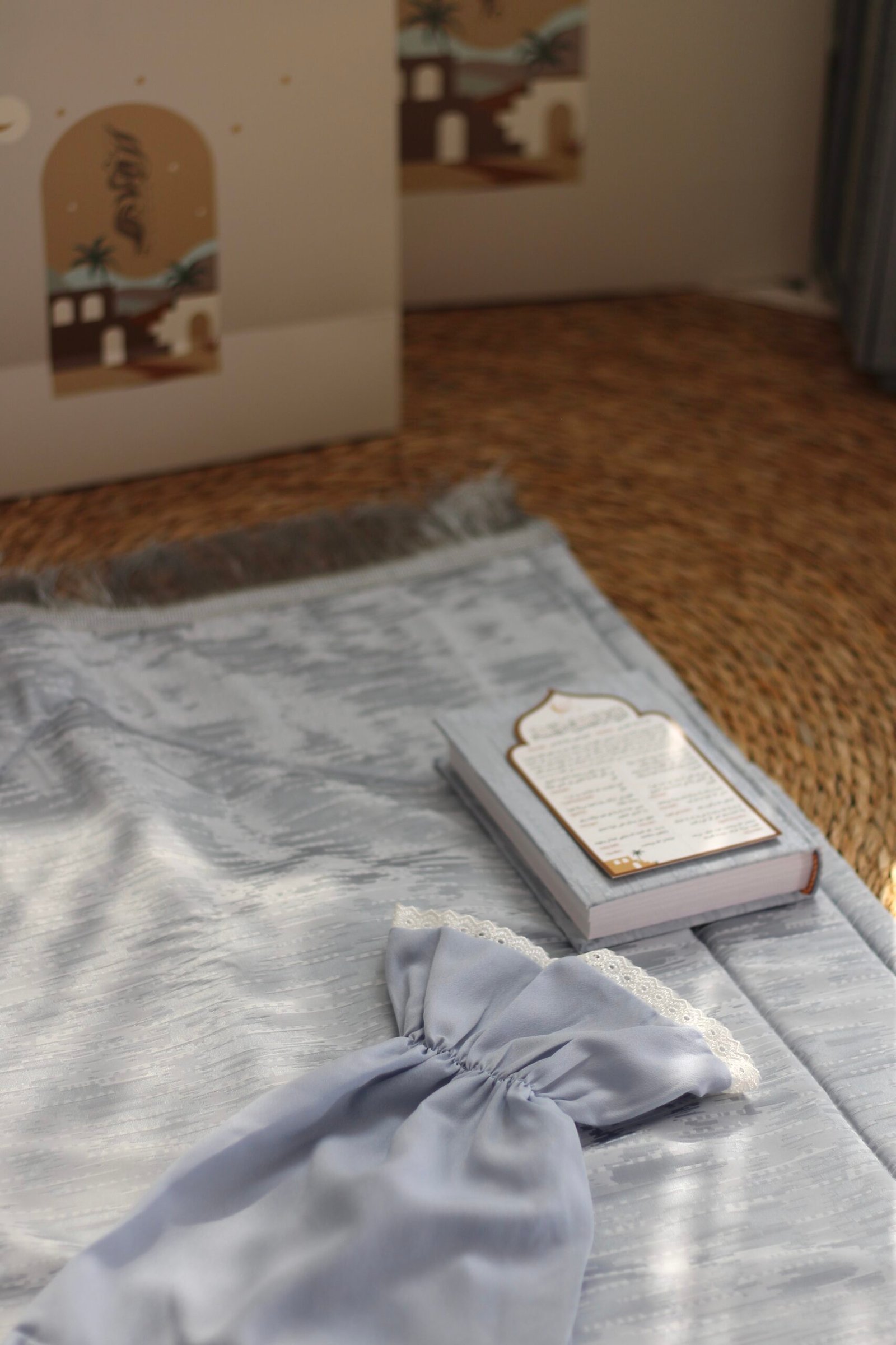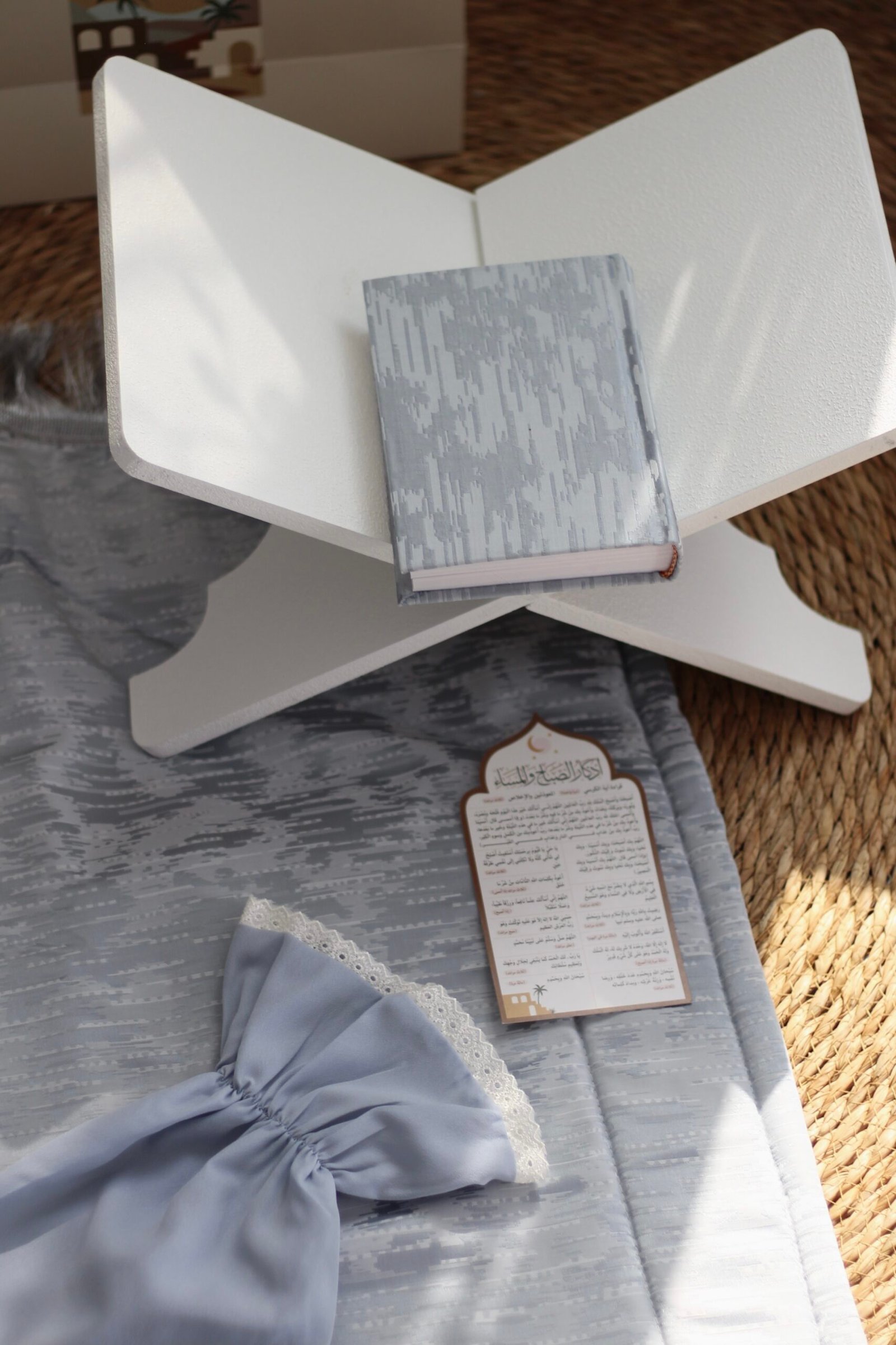 محتوى الطقم (مصحف مغلف ، لبس صلاه واسع فضفاض بطول ٥٨ سانتي ، سجاده مبطنه إسفنج )